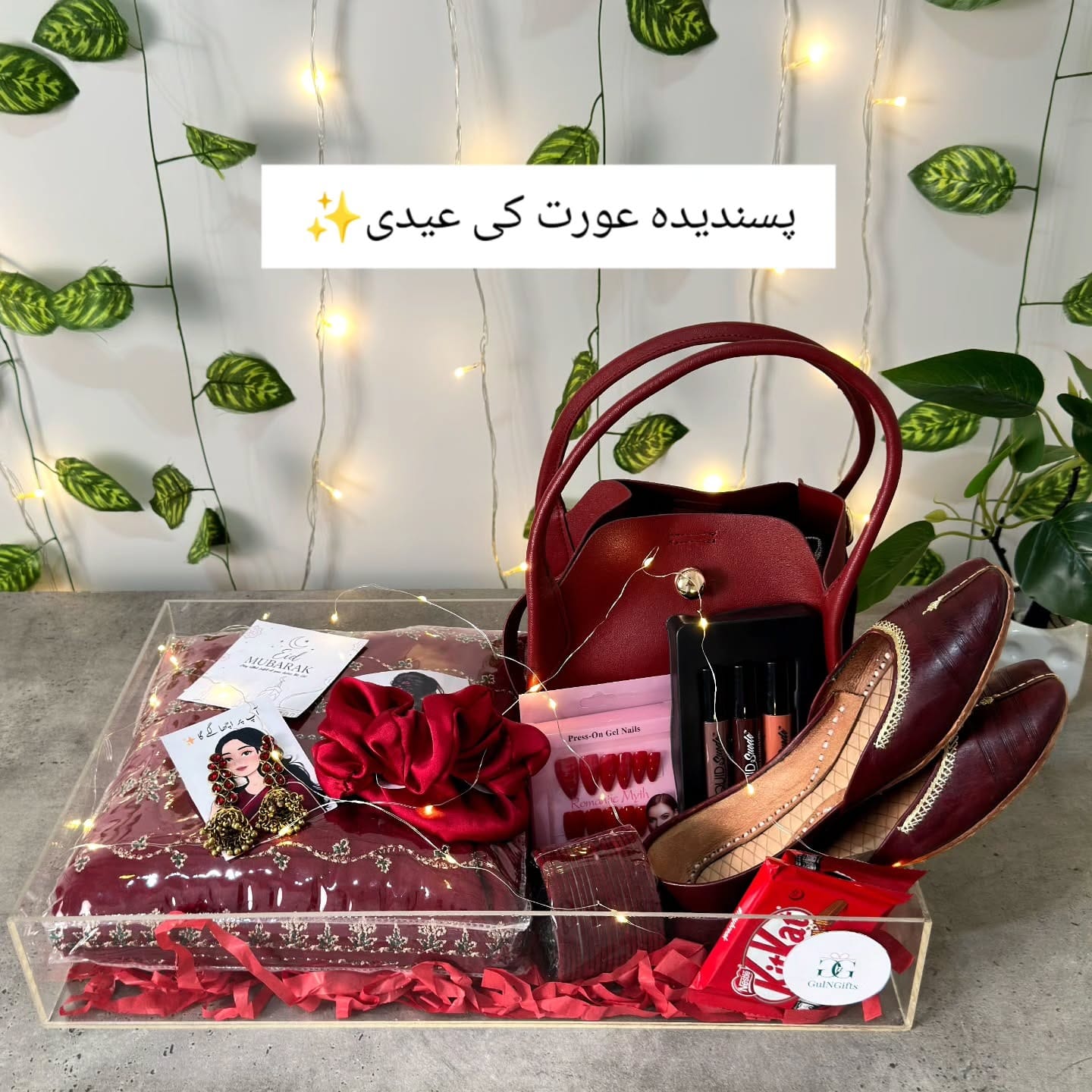 Edenrobe suit, Almas bag, khussa, jhumkay, choriyan, nail set, lipgloss, scrunchies, chocolates and an Eid card in a red acrylic box.