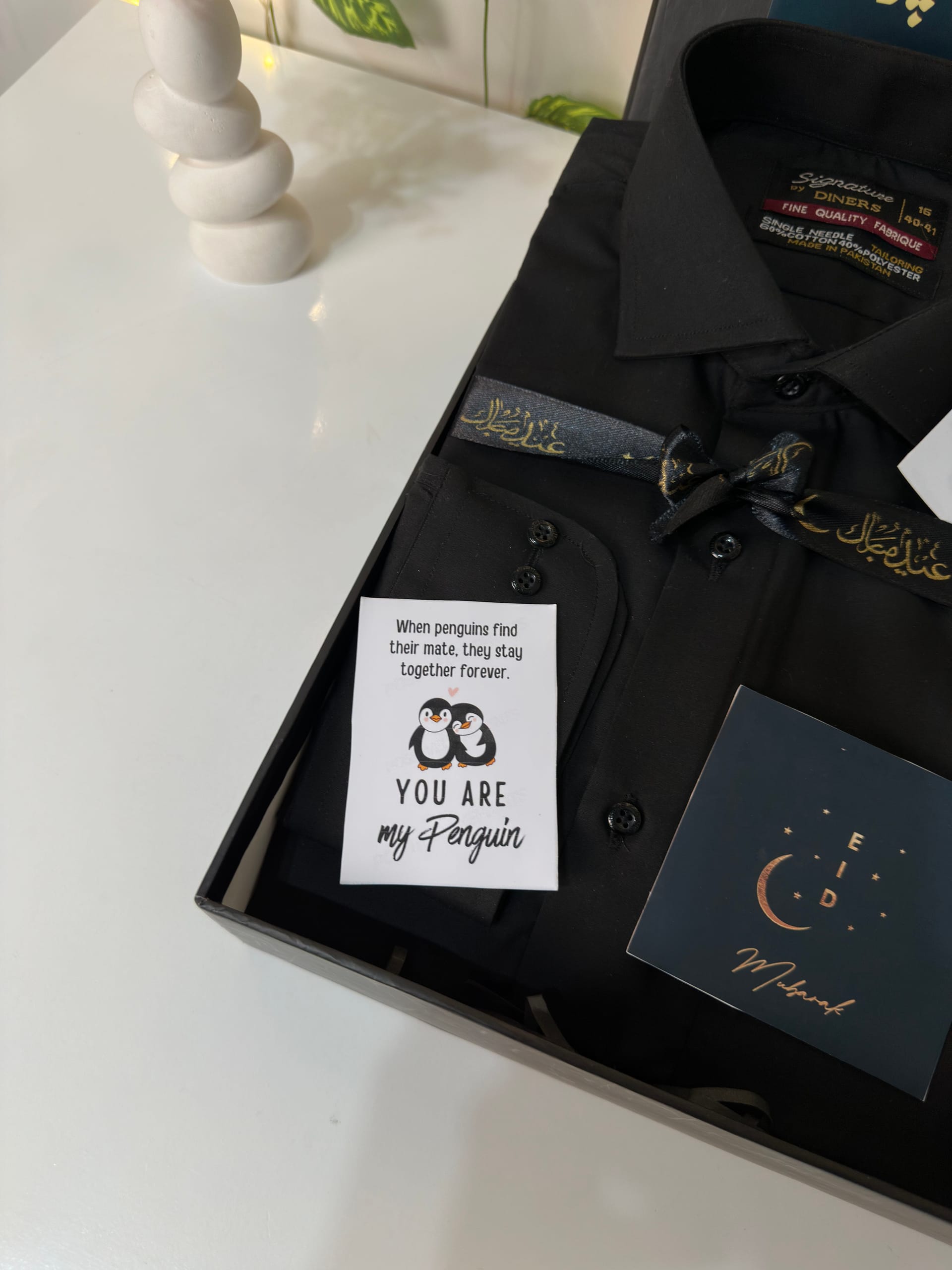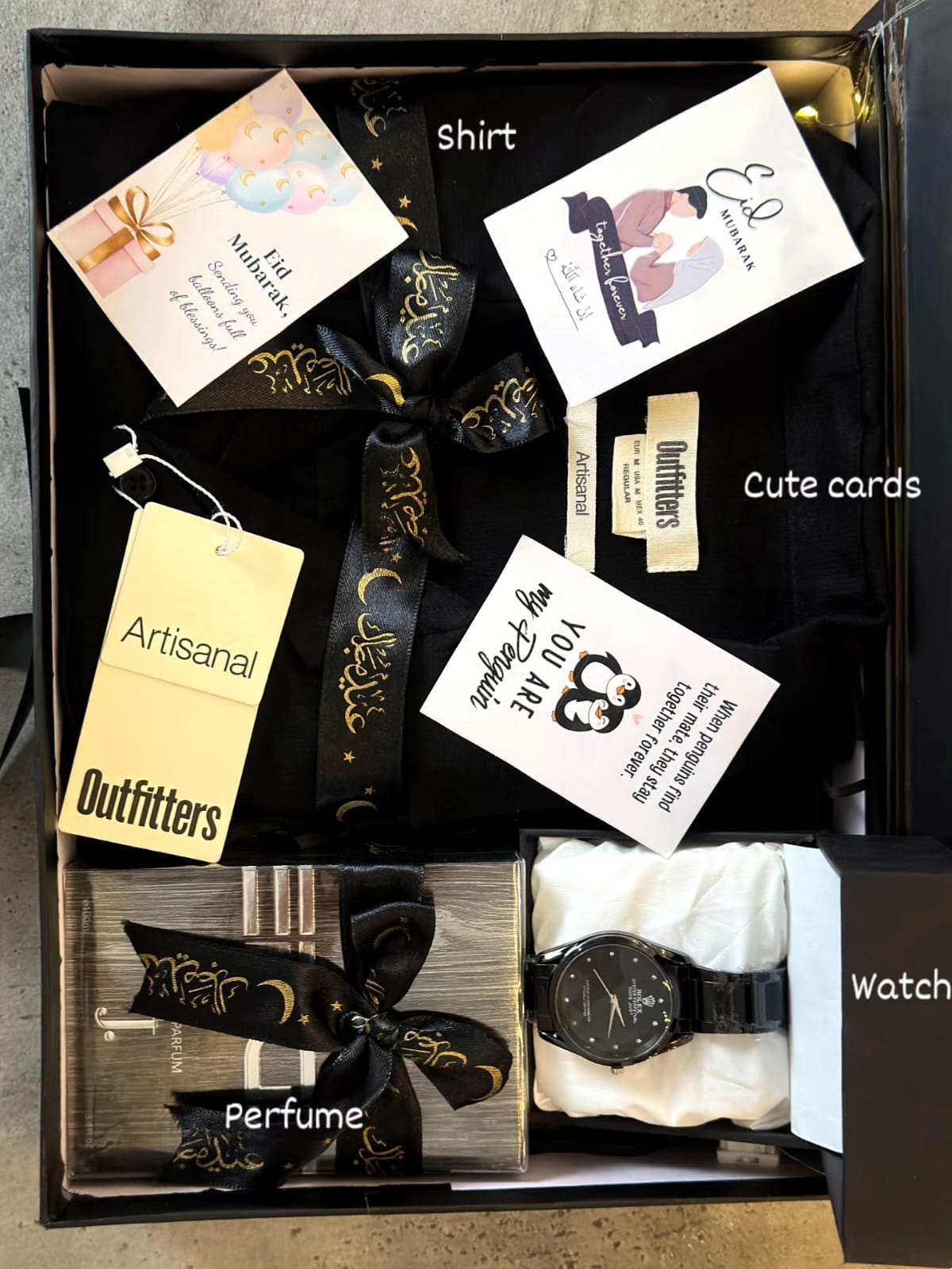 Outfitters shirt, J. Edge perfume, replica watch and a personalised Eid card in a classy black gift box.