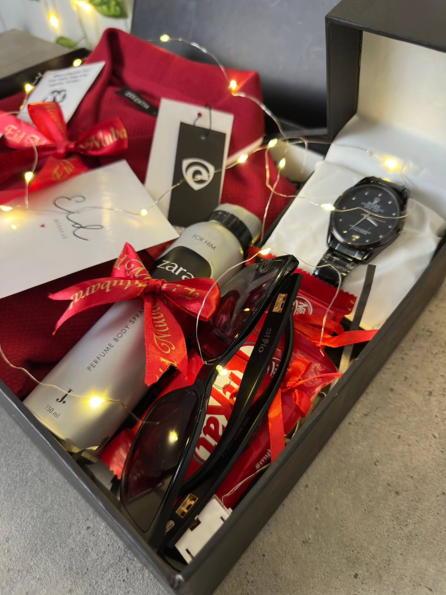 Essentia polo shirt, body spray, replica watch, sunglasses, chocolates and an Eid card in a red-and-black gift box.